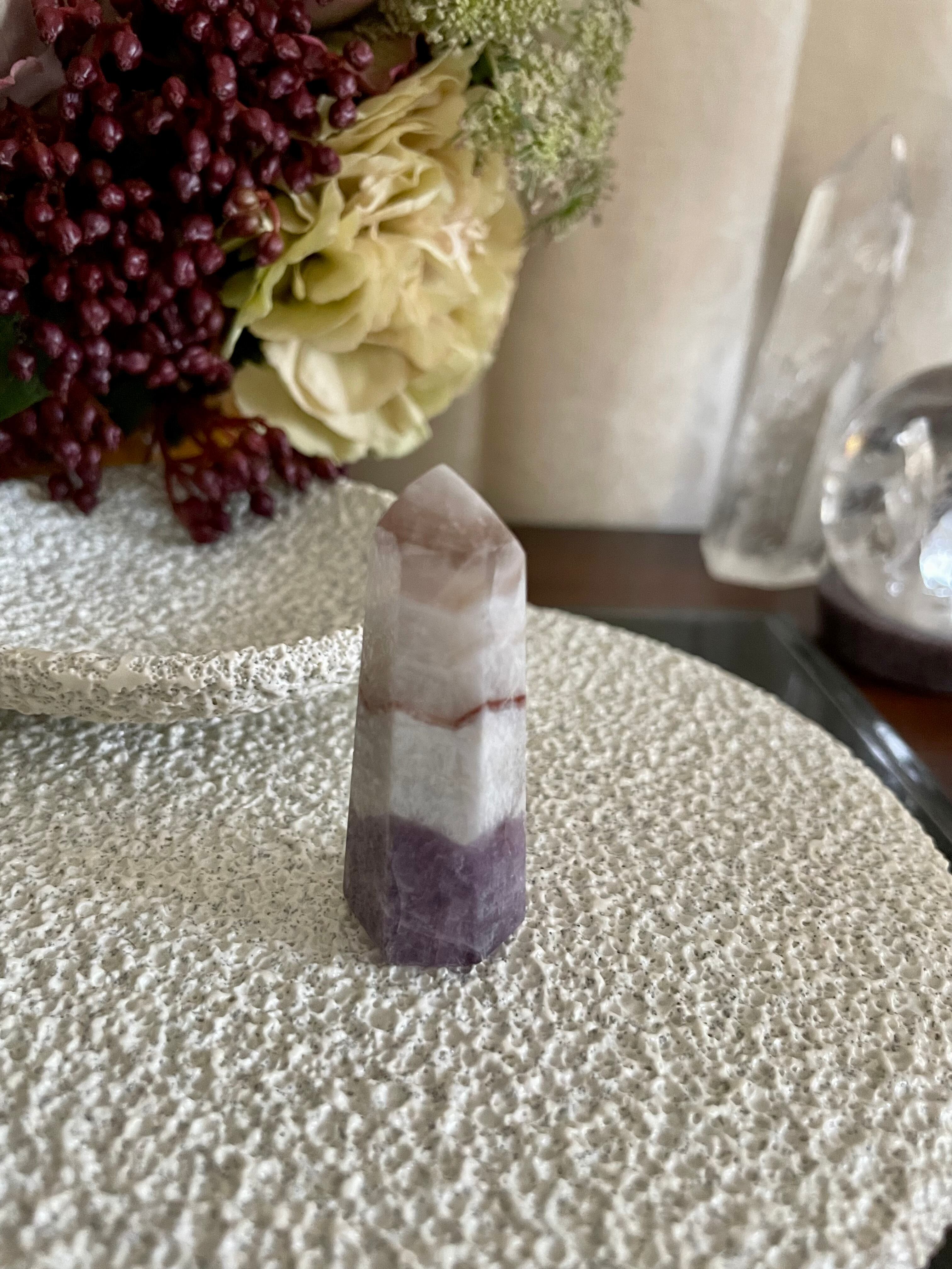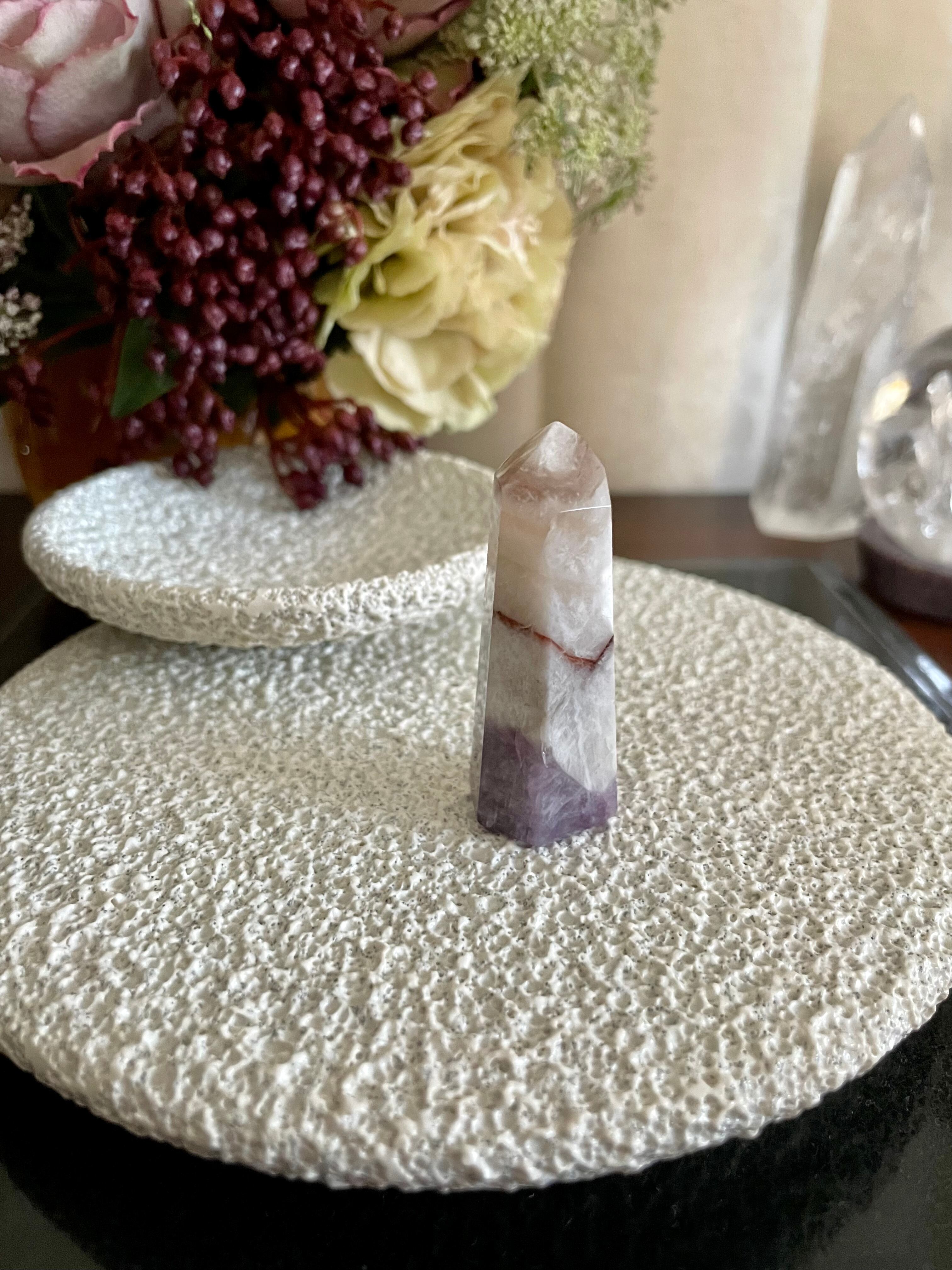 トラピチェアメジスト ポイントのご紹介です。トラピチェ型の結晶はいずれも大量の包有物が三(六)方晶系結晶の結晶軸に沿って混入したものです。