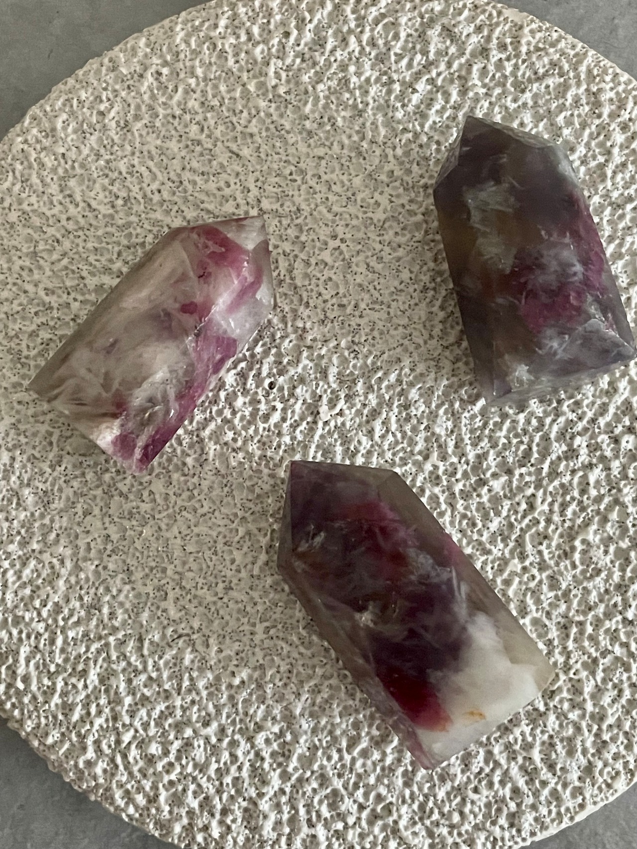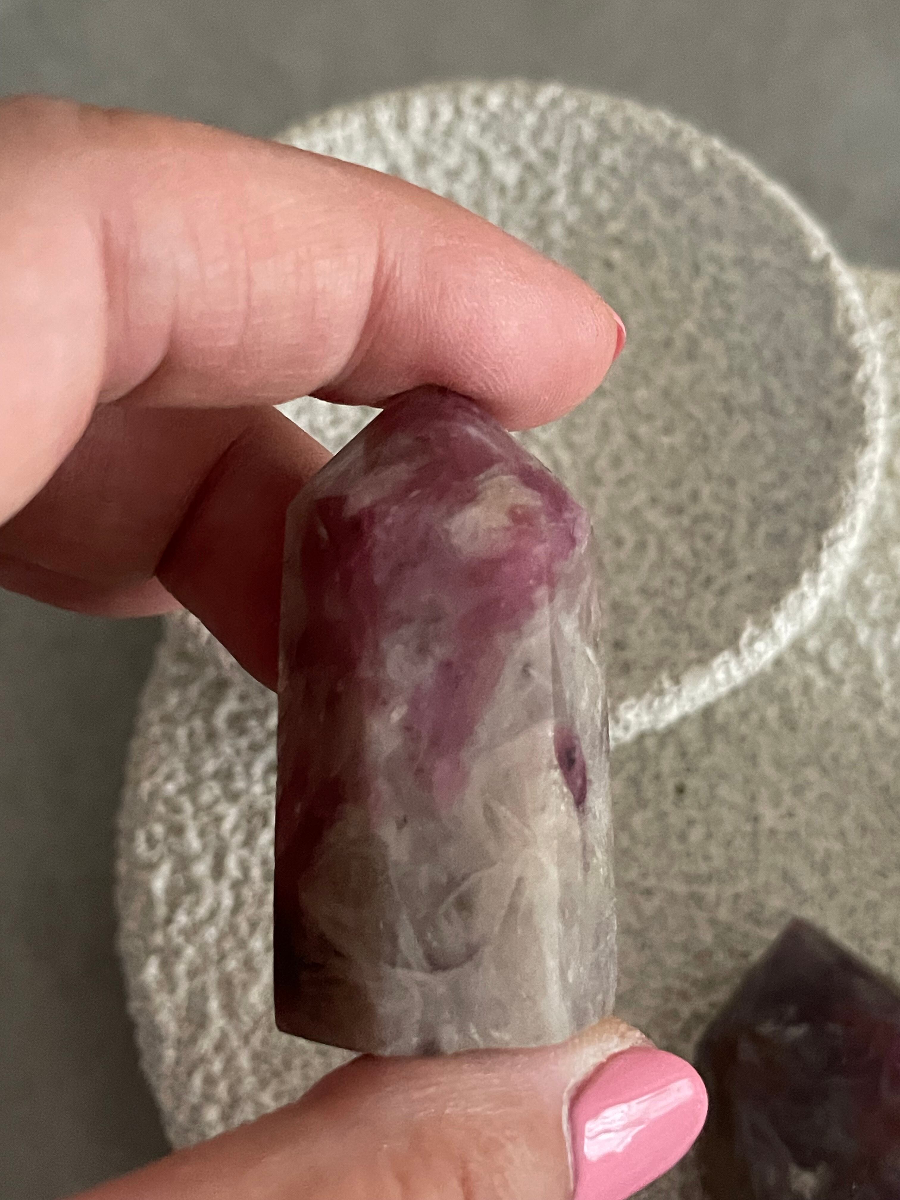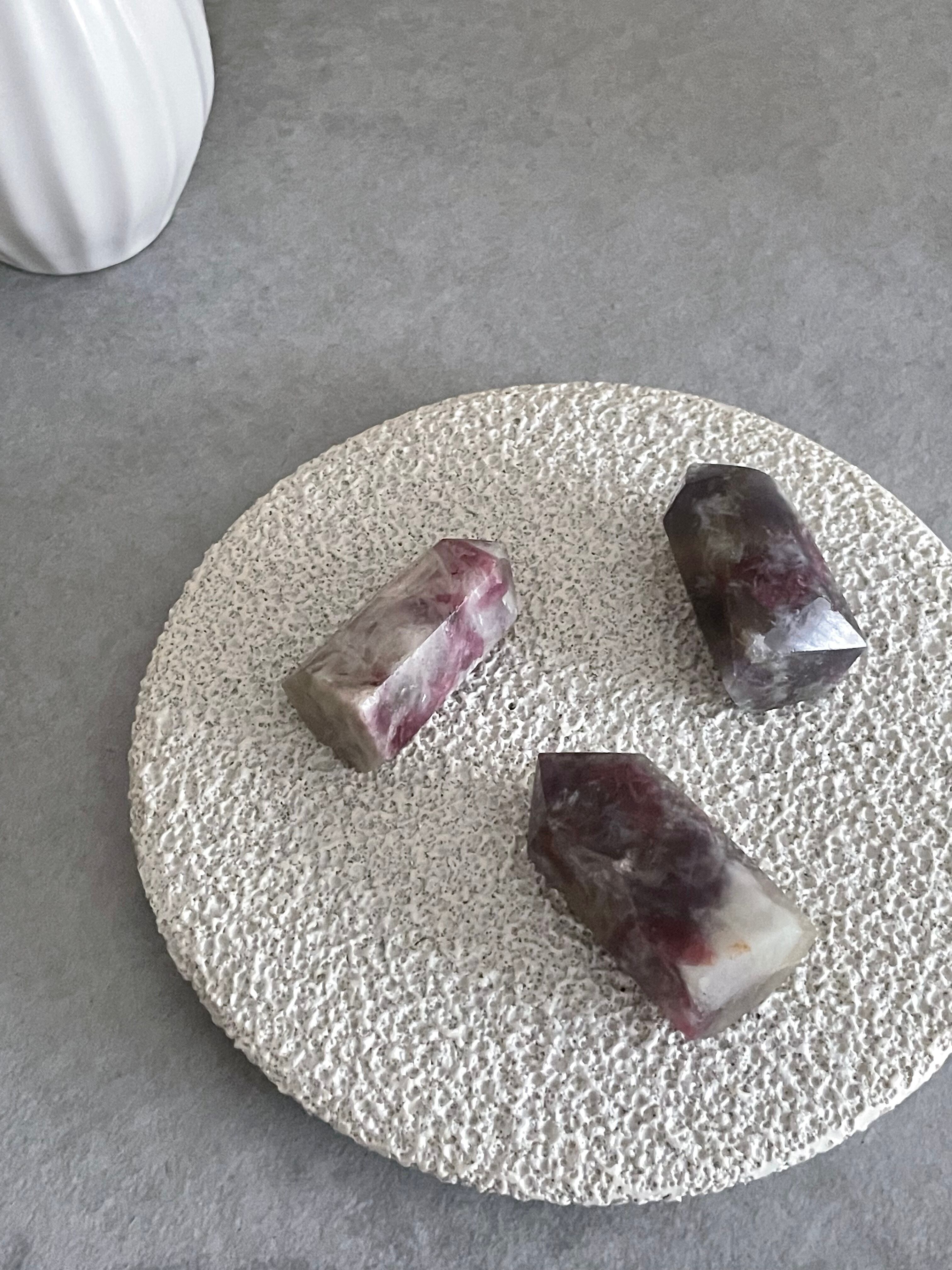 ユニコーンクリスタルは、マダガスカル産のレピドライト、クリーブランダイト、ピンクトルマリン、スモーキークォーツ、長石のブレンドです。