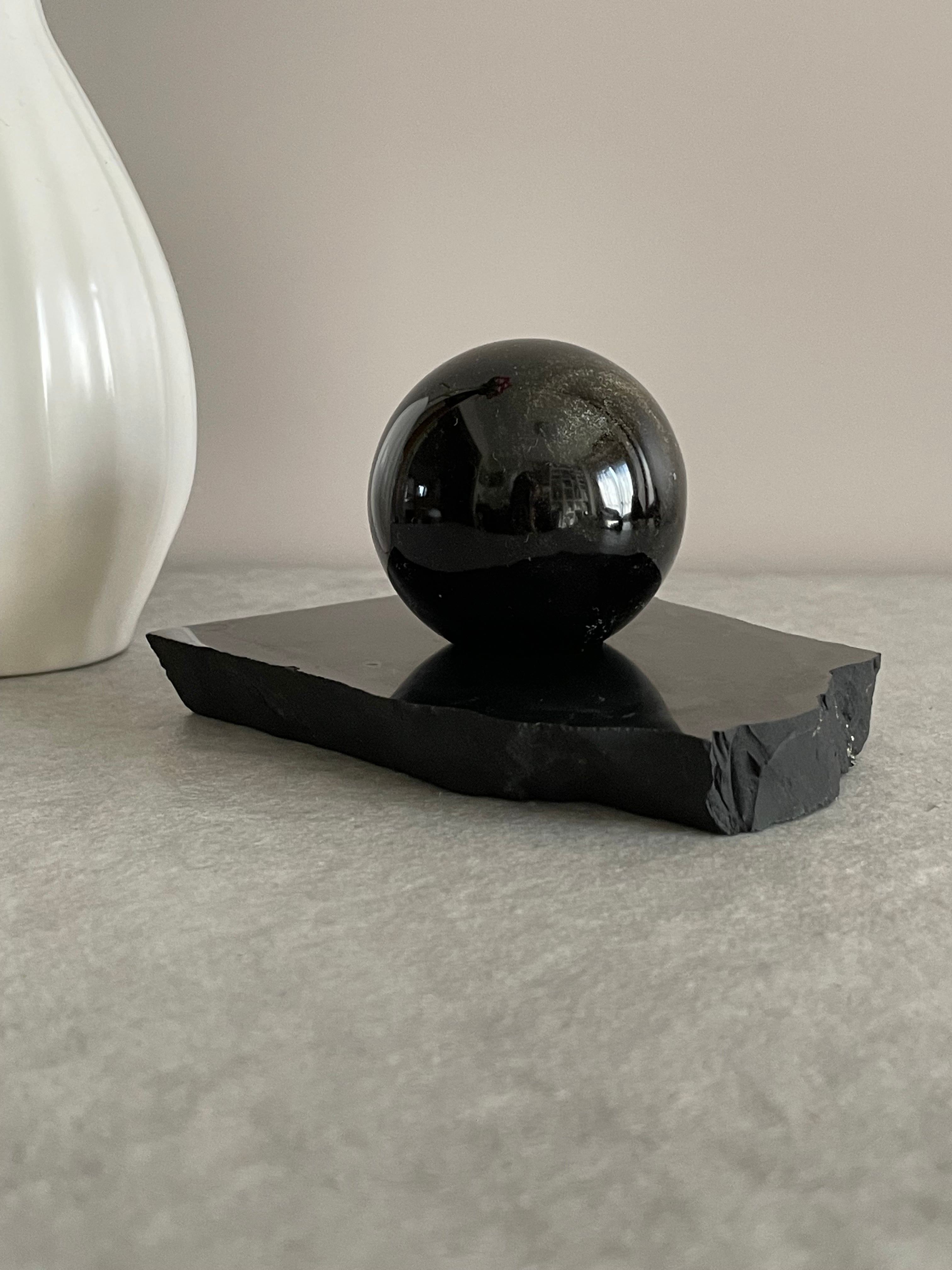 シュンガイト スフィア プレートは、自然の鉱石でできた美しいプレートです。シュンガイトは、ロシアで産出される特別な鉱石で、その石の特徴である黒い色と光沢は一見の価値ありです。