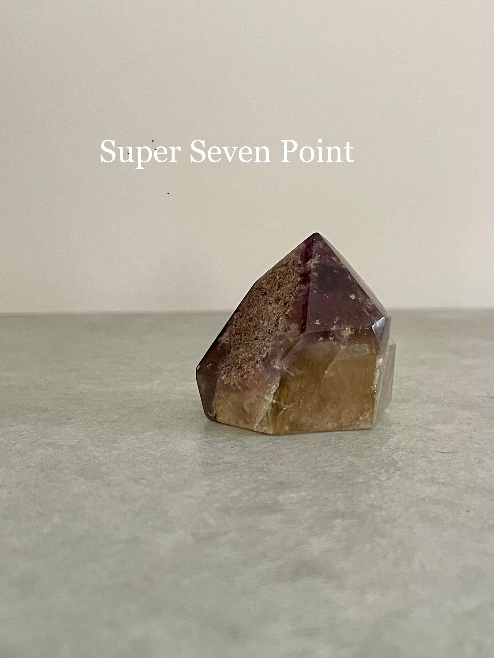 あなたのお守りにふさわしいスーパーセブン ポイントです。このパワーストーンは、世界中で大変希少な7つの鉱物が一つの標本になった特別な存在です。アメジスト、クリアクォーツ、ルチル、ゲーサイト、レピドクロサイト、カコクセナイト(ヘマタイトが内包されていることもあります)です。