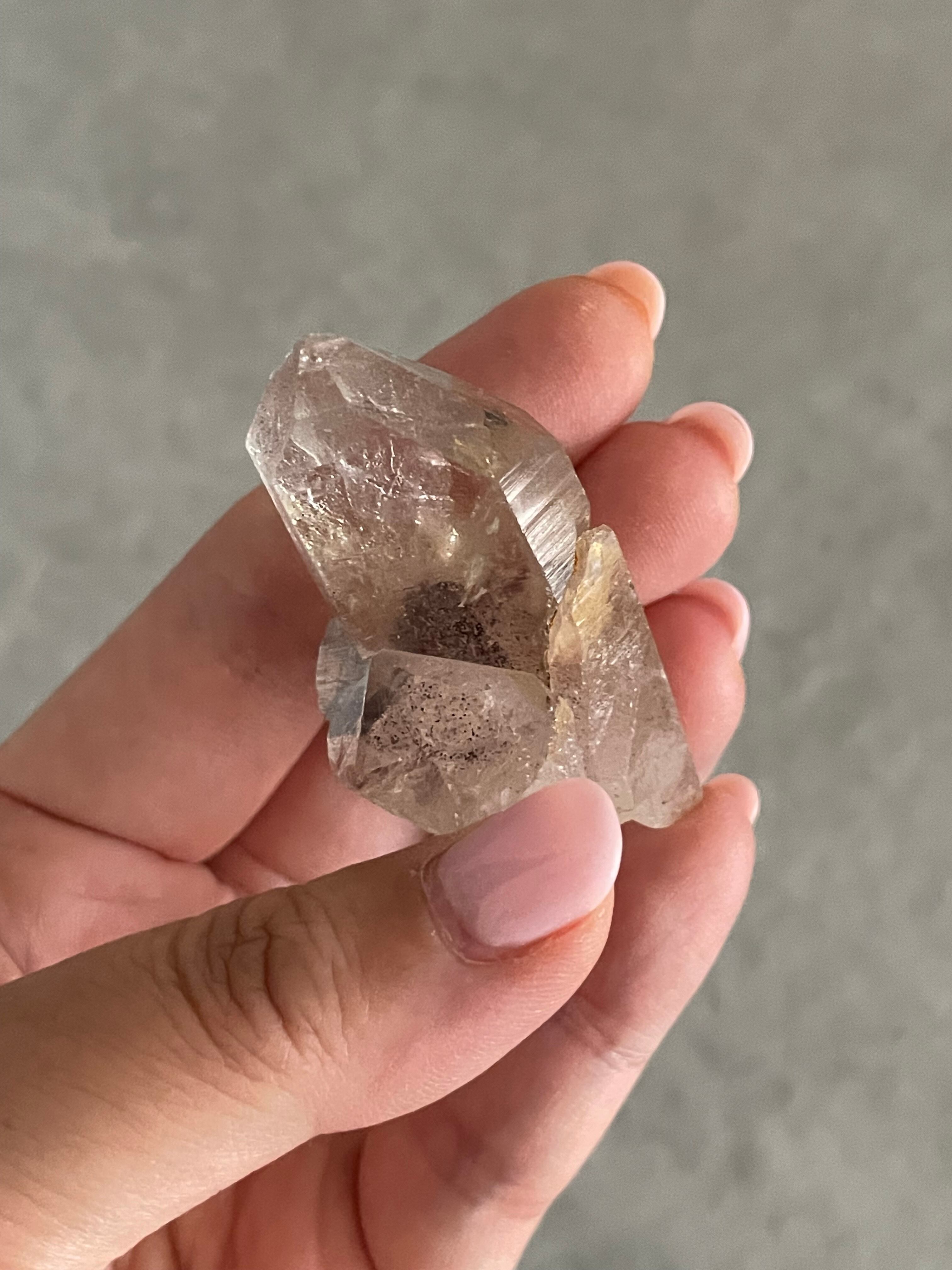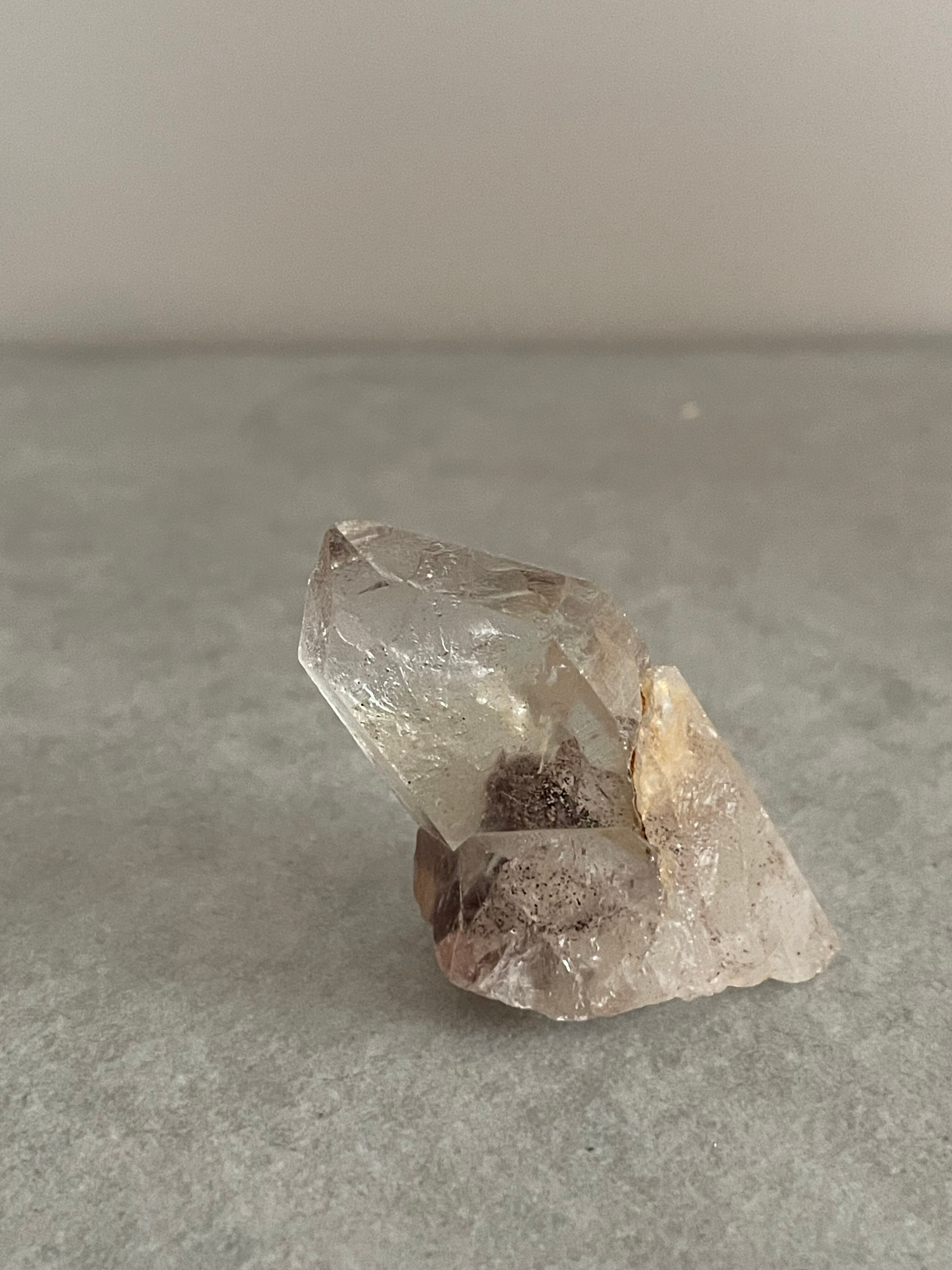 サンセットファントム ヒマラヤンクォーツ。神秘的なファントムが石に宿り、夕日のような美しい色合いを演出します。このサンセットファントムは、ヒマラヤンクォーツの中でも特に希少な透明度を持っており、輝きも一段と引き立っています。