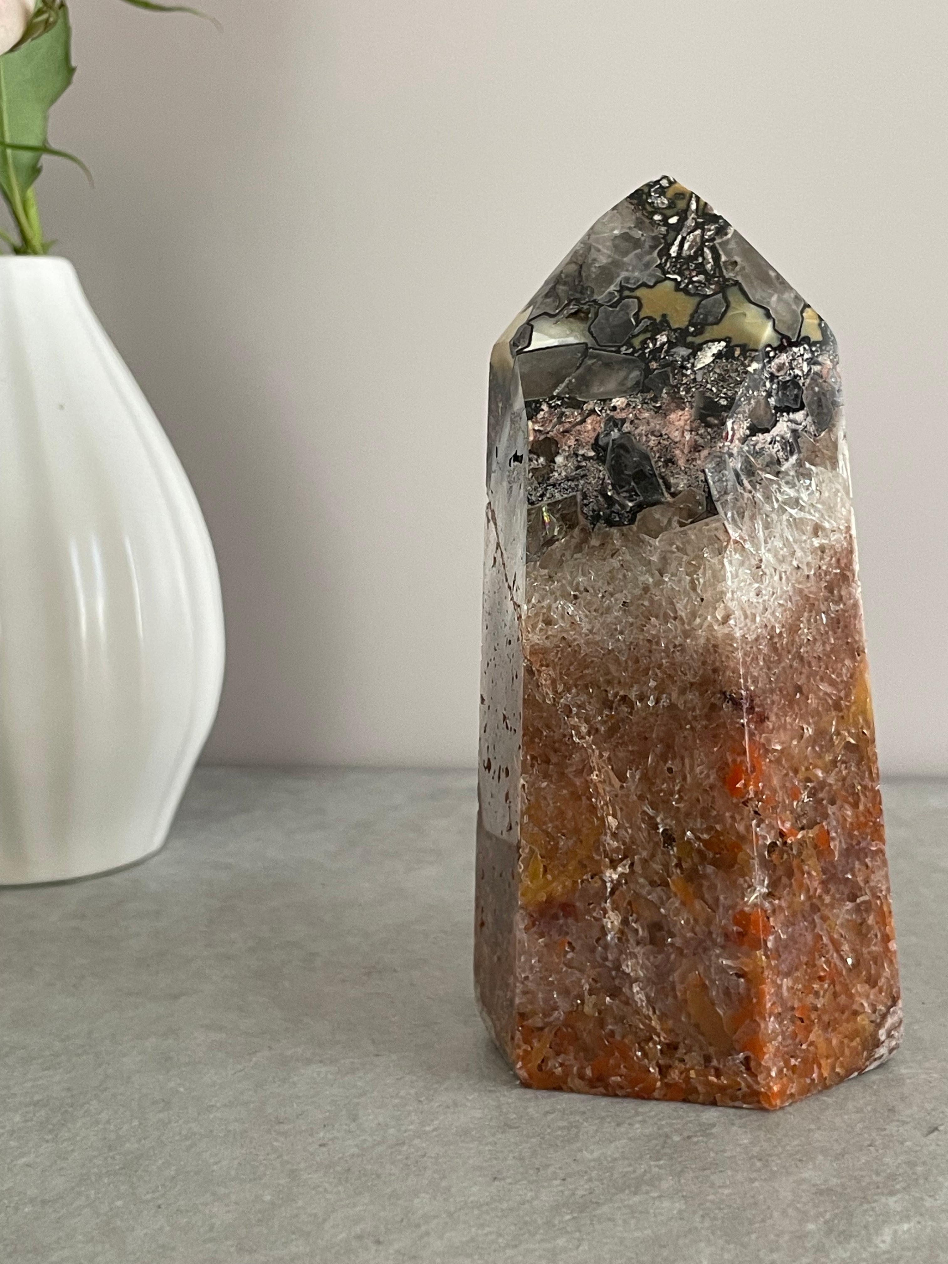 あまり馴染みのない名前かと思いますが、モザイクカルセドニークォーツは、クリア&スモーキークォーツ、ヘマタイト、オパール、マンガン、グラナイト、カルセドニー、オレンジカルサイト、グラファイト、レッドアベンチュリンからなるユニークで美しいミックスの鉱物です。