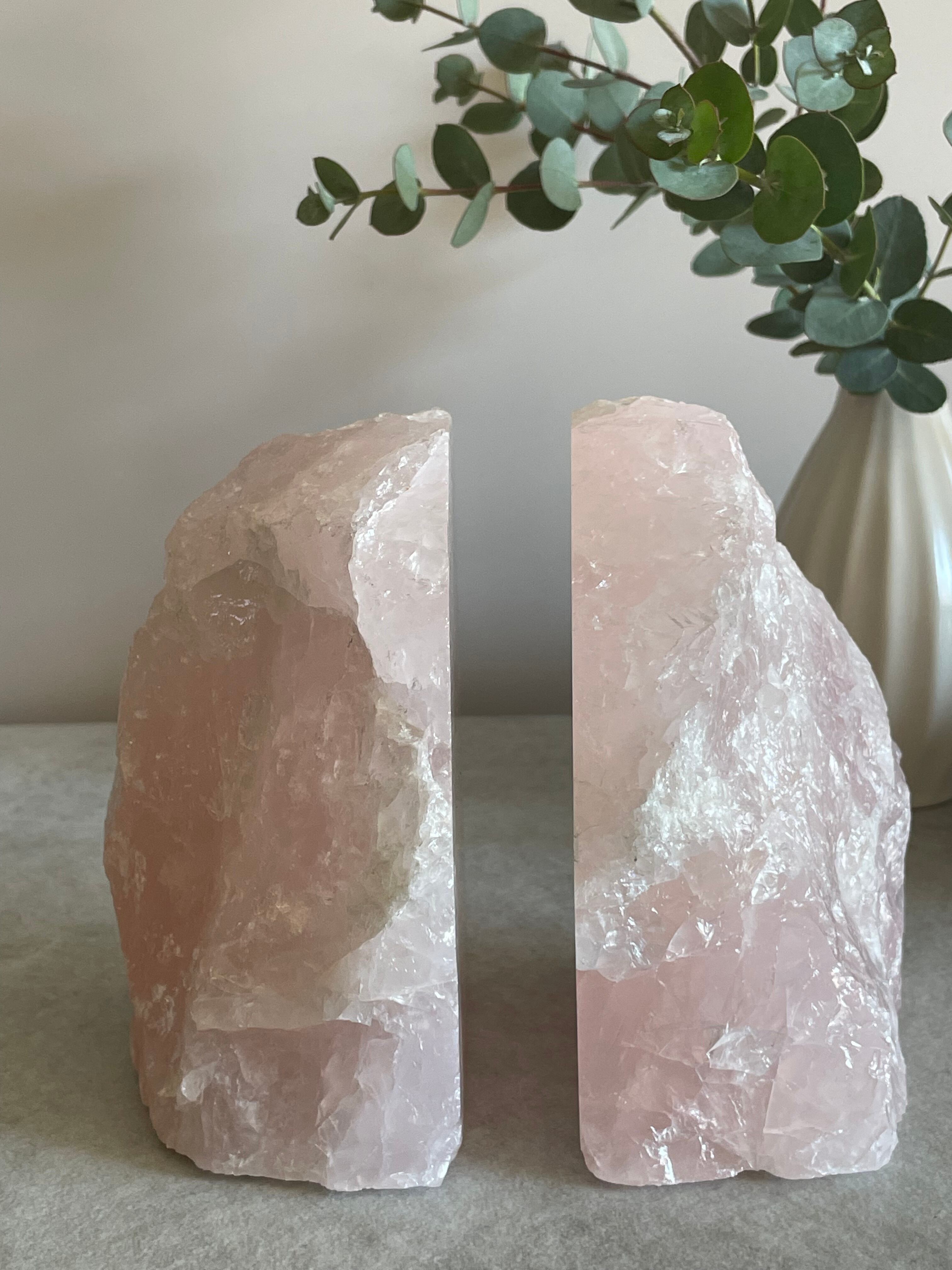 キラキラと輝くローズクオーツが、お部屋に上品なアクセントを加えるブックエンド。天然のパワーストーンを使用したインテリアアイテムで、落ち着いた空間を演出します。結晶がきれいに並んだ一対のブックエンドは、本だけでなくCDやDVDの収納にも最適です。