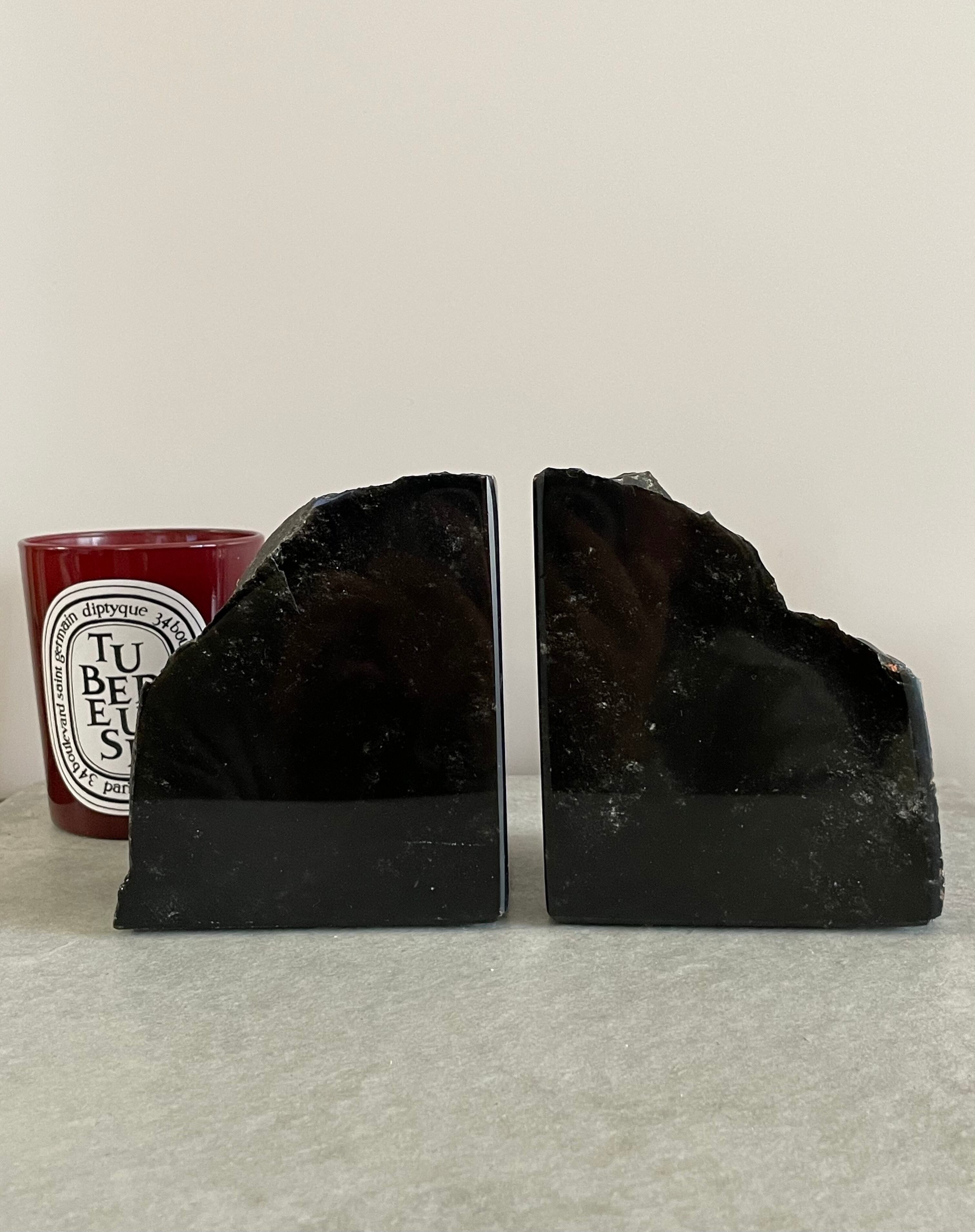 ブラックオブシディアンのブックエンドは、あなたのホームオフィスやリビングルームに幸運を呼び込み、心地よい空間を演出します。是非、このパワフルな天然石の魅力をお試しください。